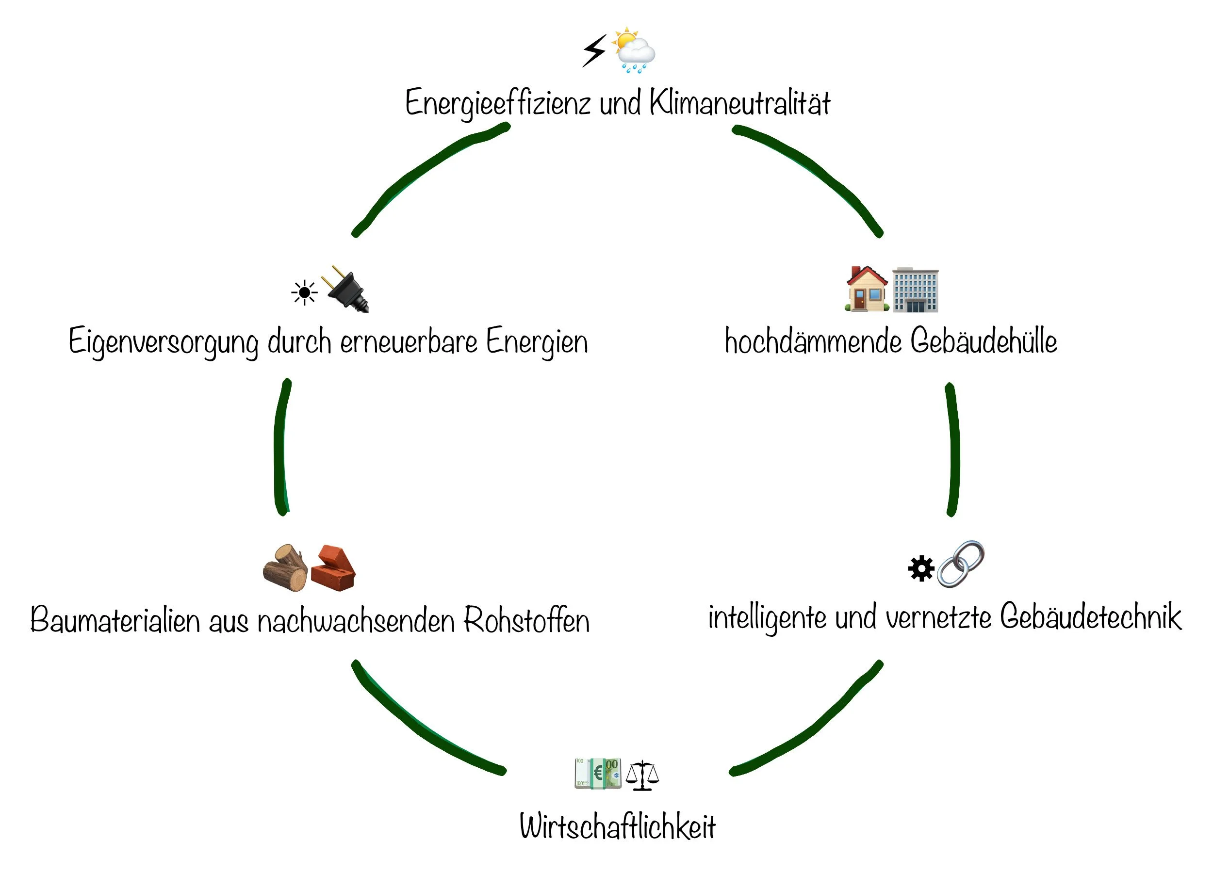 Wenn alle Teilaspekte wie Architektur, Baustoffe, Gebäudehülle/-struktur, technische Gebäudeausrüstung, Nutzungsflexibilität und Wirtschaftlichkeit sinnvoll und optimal miteinander agieren, werden Sie nicht nur ein wohliges Zuhause haben, sondern auch den Energieverbrauch senken, Kosten sparen, Emissionen reduzieren und den Wert Ihres Gebäudes steigern können.